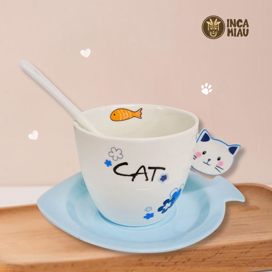 Lindo set de plato y taza con diseño de gato. Hecho de cerámica de alta calidad.